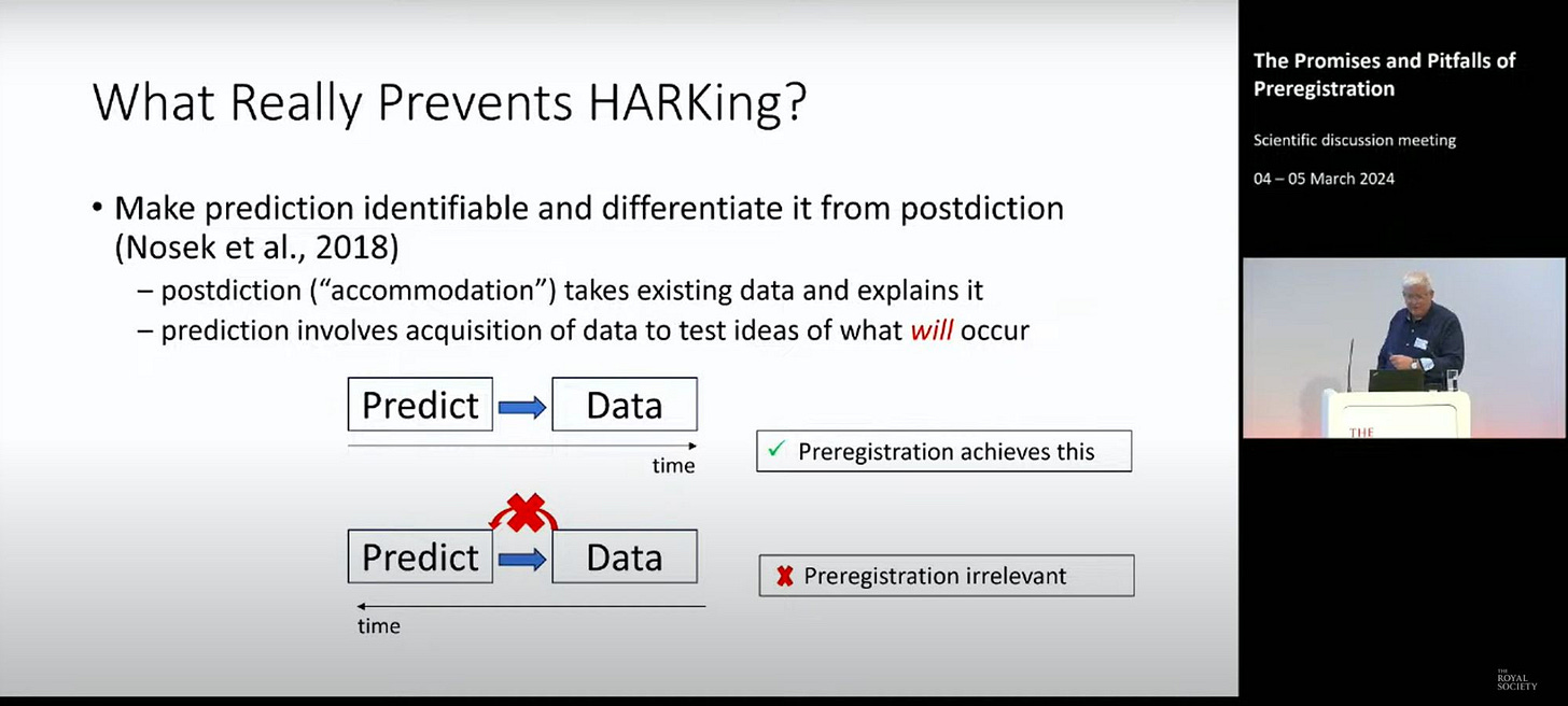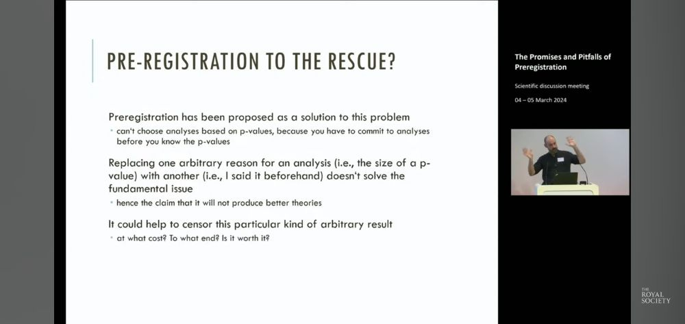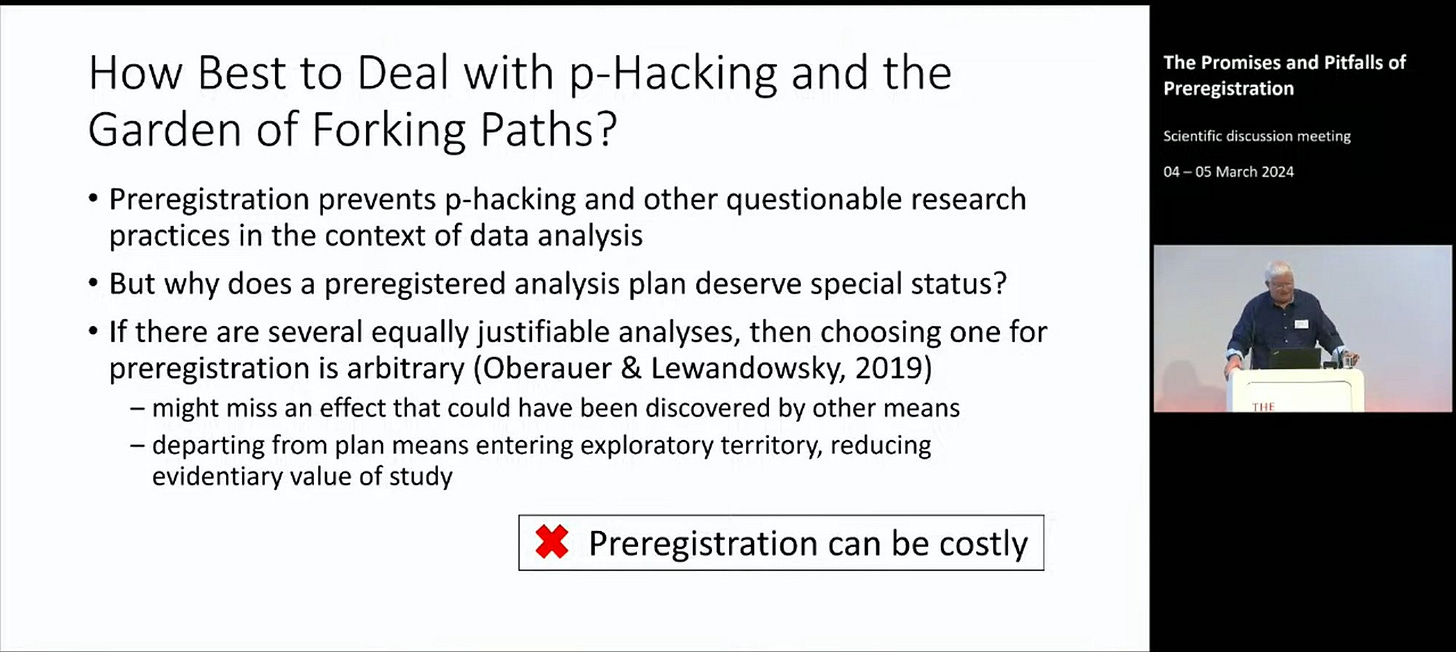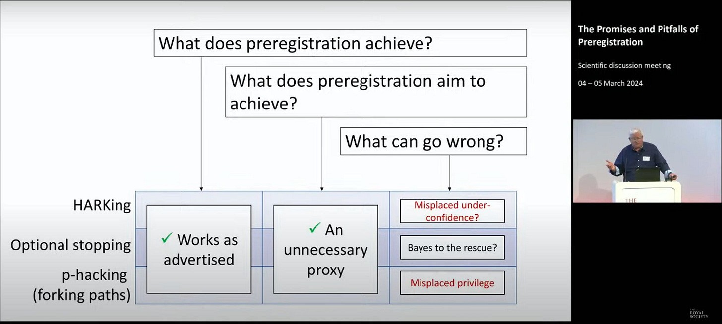 A conference called “The promises and pitfalls of preregistration” was hosted by the Royal Society in London from 4th-5th March 2024. Here, I discuss the presentations by Chris Donkin and Stephan Lewandowsky, both of which consider some of the potential “pitfalls” of preregistration.