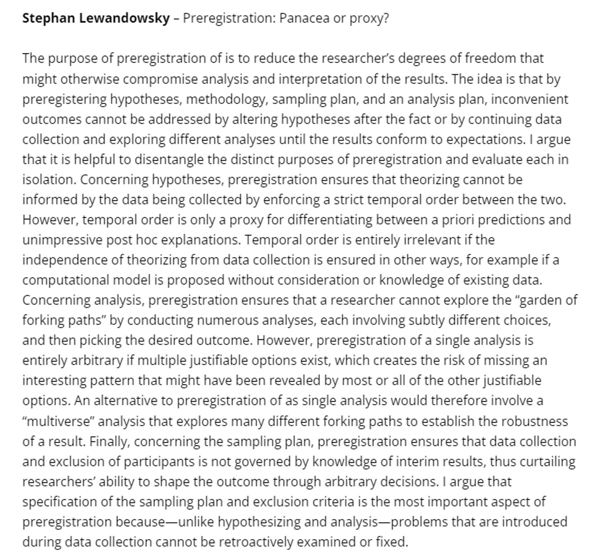 Stephan concludes that preregistration “works as advertised” but that it does so as “an unnecessary proxy” that comes with certain costs, including “misplaced underconfidence” about HARKed hypotheses and “misplaced privileging” of the particular forking path(s) that happen to have been arbitrarily preregistered.