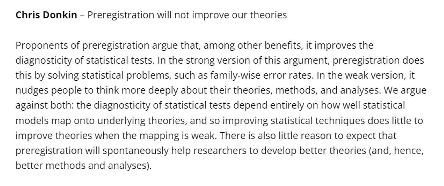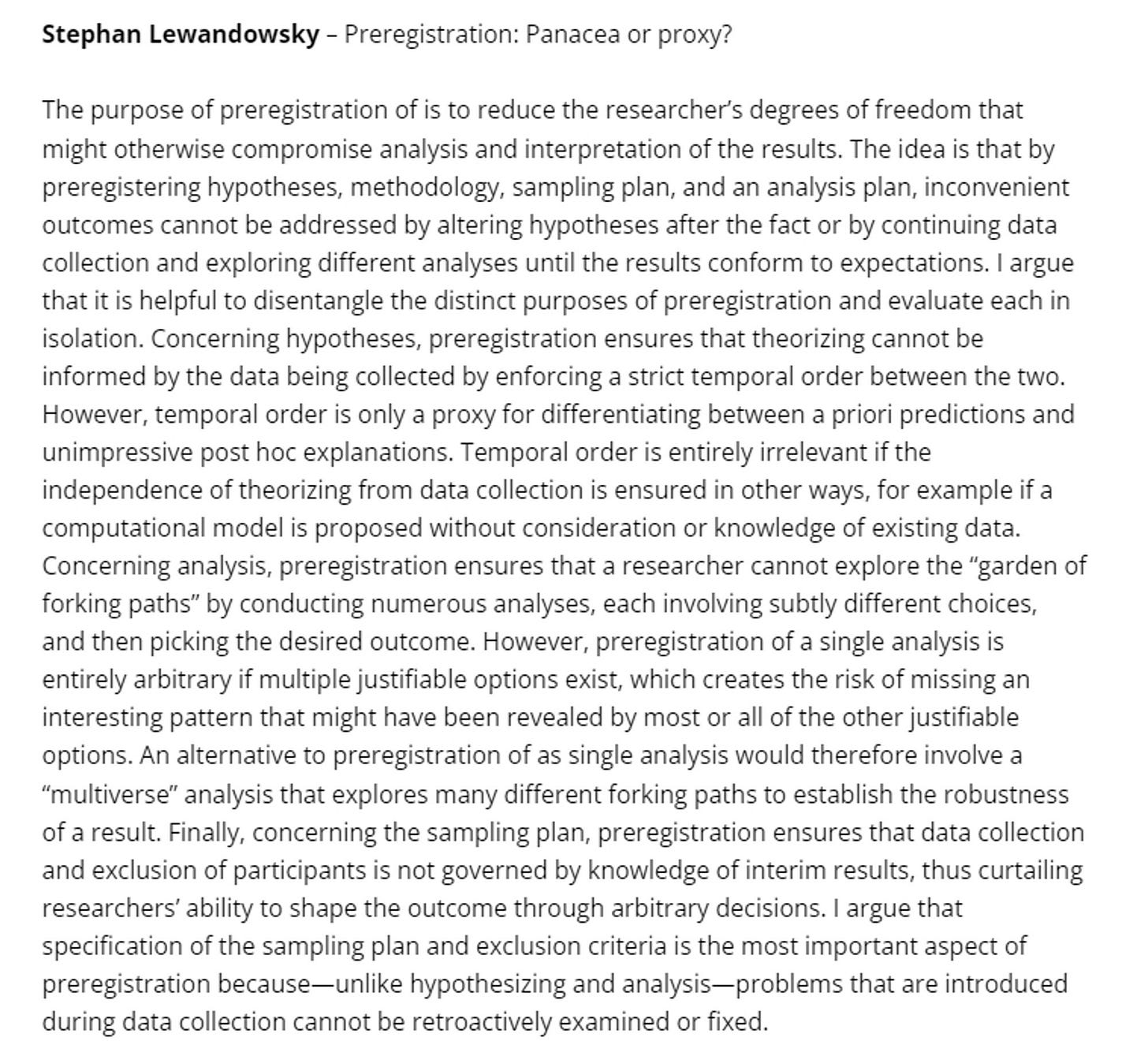 Preregistration advocates would argue that preregistration is not supposed to strengthen the link between results and reasoning. It’s merely intended to distinguish confirmatory tests from exploratory tests. But they also concede that confirmatory tests are not necessarily better than exploratory tests because researchers can preregister low quality hypotheses, methods, and analyses. However, if an exploratory test can be better than a confirmatory test, then it’s unclear why we need the confirmatory-exploratory distinction in the first place. Surely, the most rigorous scientific evaluation should consider each test on its own merits, regardless of whether it’s been preregistered? Here’s a quote from my article with Chris:
